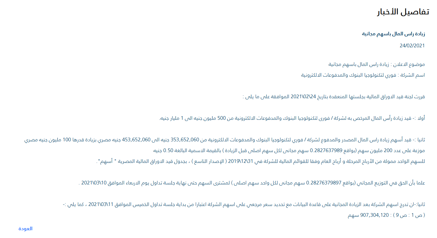 ومنحت لجنة القيد بالبورصة المصرية فوري أمس الضوء الأخضر لمضاعفة رأسمالها المرخص به إلى مليار جنيه، وكذلك زيادة رأس مالها المصدر بمقدار 100 مليون جنيه إلى 453.65 مليون جنيه، عن طريق إصدار 200 مليون سهم مجاني بقيمة اسمية للسهم قدرها 50 قرشا تمول من الأرباح المرحلة.