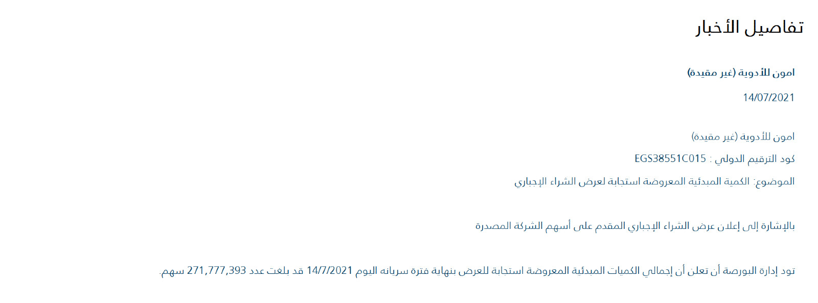 الطريق بات ممهدا أمام شركة أيه دي كيو القابضة للاستحواذ على شركة آمون فارما للصناعات الدوائية، بعد أن وافق مساهمو الشركة على بيع 99.9% من أسهمها لصالح الشركة الإماراتية مع انتهاء فترة سريان عرض الشراء الإجباري المقدم منها أمس، والتي استمرت لمدة 10 أيام، وفق ما أعلنته البورصة المصرية في منشور أمس الأربعاء. وباع المساهمون 271.7 مليون سهم من إجمالي أسهم الشركة البالغ عددها 272.2 مليون سهم إلى شركة ألترا ويلفير ليميتيد التابعة لـ “أيه دي كيو”. وكانت الهيئة العامة للرقابة المالية قد وافقت أواخر الشهر الماضي على العرض البالغ 37.8 جنيه للسهم، والذي يضع قيمة الشركة عند 10.3 مليار جنيه (655.4 مليون دولار).