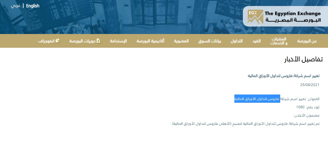 أخبار أخرى متعلقة بالسوق – تغير اسم شركة فاروس لتداول الأوراق المالية إلى شركة الأهلي فاروس لتداول الأوراق المالية، وفق بيان للبورصة المصرية. وكانت شركة الأهلي كابيتال القابضة، الذراع الاستثمارية للبنك الأهلي المصري، استحوذت على فاروس لتداول الأوراق المالية في أواخر عام 2019 في صفقة بقيمة 120 مليون جنيه.