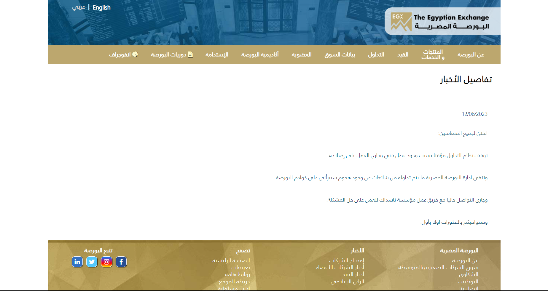 توقف نظام التداول في البورصة المصرية خلال جلسة اليوم بسبب عطل فني، حسبما أعلنت البورصة. ونفت إدارة البورصة الشائعات المتداولة بشأن وجود هجوم سيبراني على خوادمها، مشيرة إلى تواصلها مع فريق عمل مؤسسة ناسداك للعمل على حل المشكلة. ونجحت البورصة في حل العطل، مؤكدة استئناف التداول غدا في المواعيد المعتادة.
