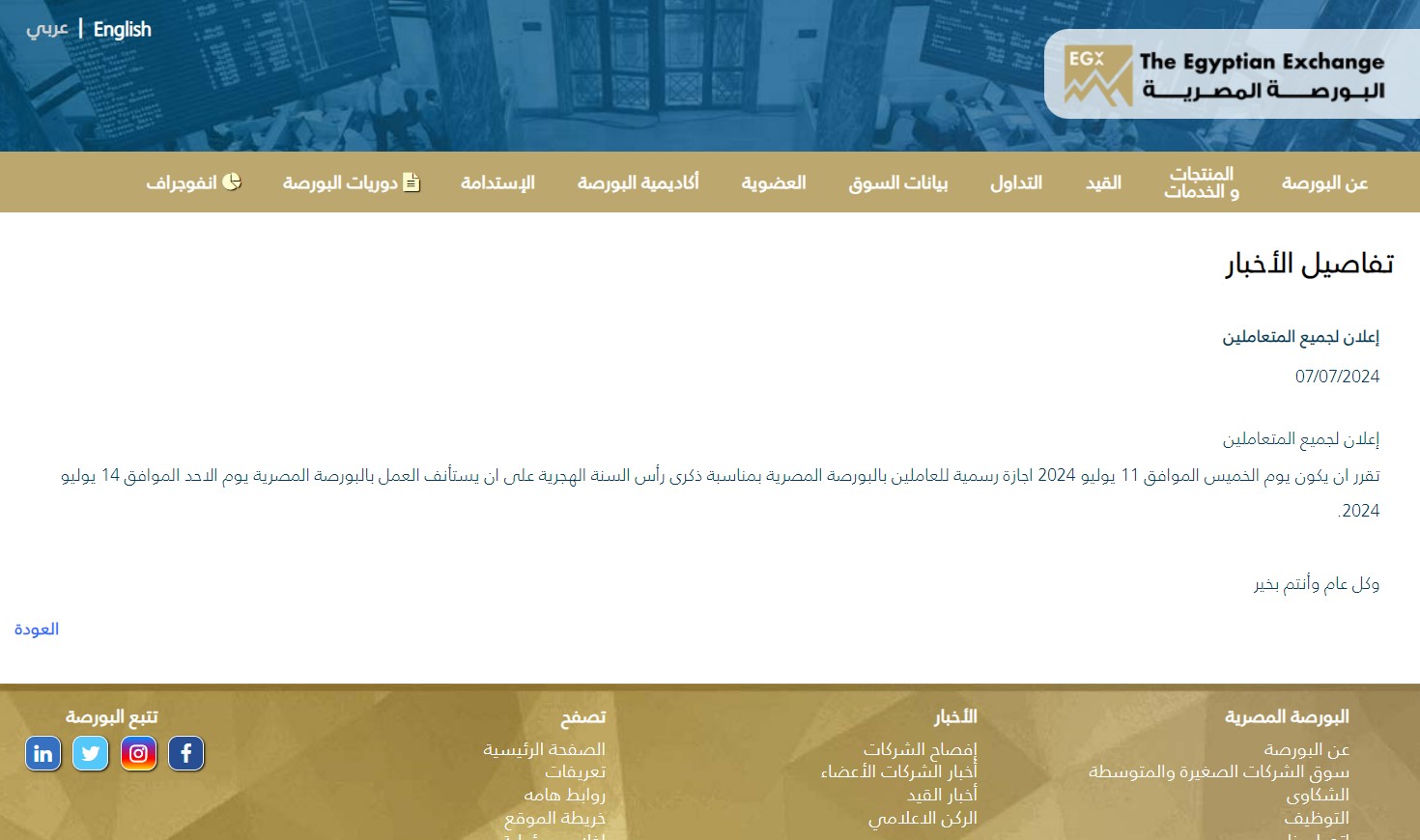 البورصة إجازة الخميس المقبل: أعلنت البورصة المصرية الخميس المقبل 11 يوليو إجازة رسمية بمناسبة رأس السنة الهجرية، وفق إعلانمن البورصة. وستكون البنوك والعاملون في القطاعين العام والخاص في إجازة أيضا للاحتفال بهذه المناسبة، بحسب بيانات سابقة من مجلس الوزراء والبنك المركزي.