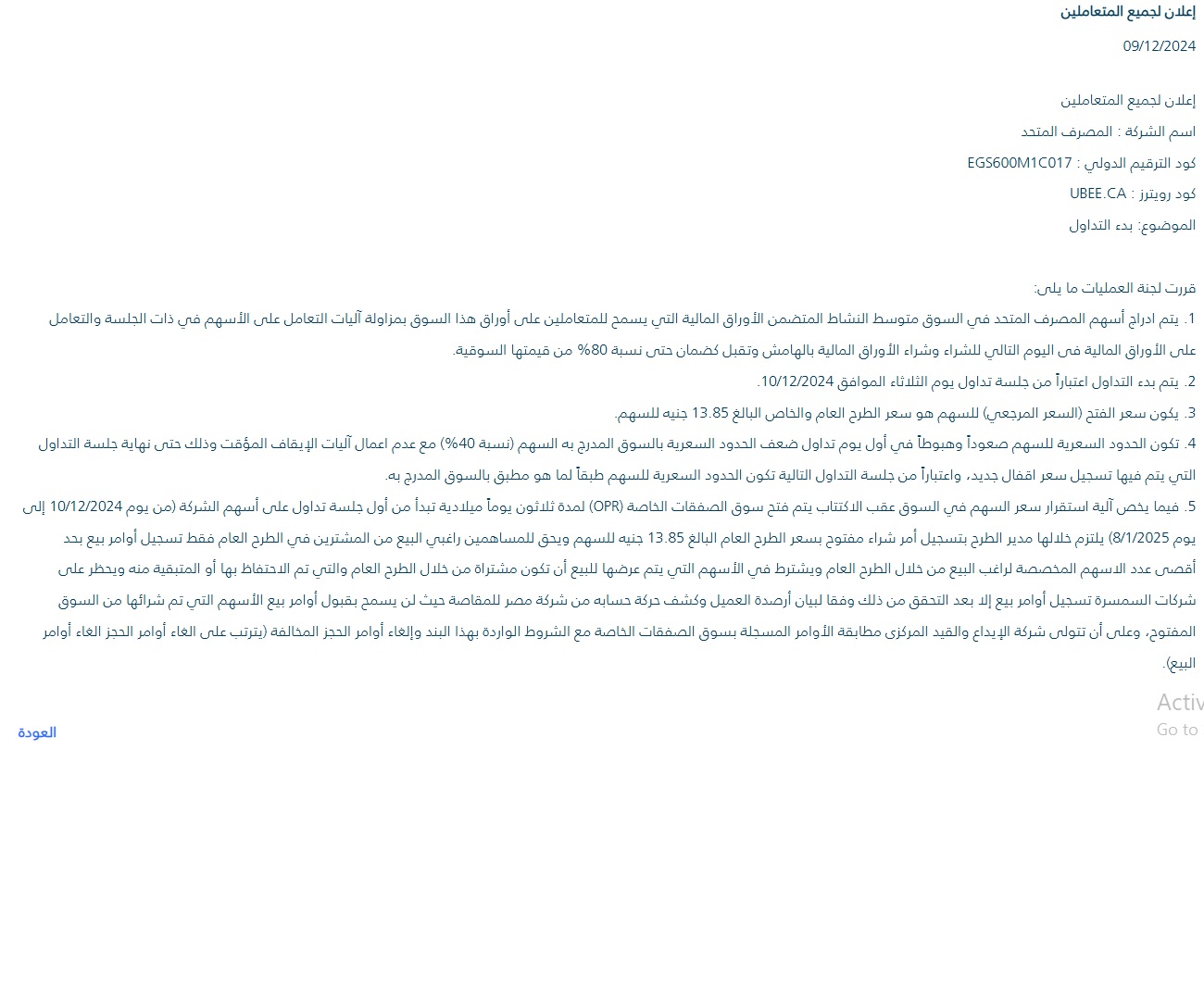 1#- المصرف المتحد يدق أجراس البورصة هذا الصباح: يبدأ تداول أسهم المصرف المتحد في البورصة المصرية اليوم تحت رمز "UBEE.CA"، بعد إغلاق الاكتتاب بتغطية كبيرة في شريحتي الطرح الخاص والعام، بسعر نهائي عند 13.85 جنيه للسهم الواحد.