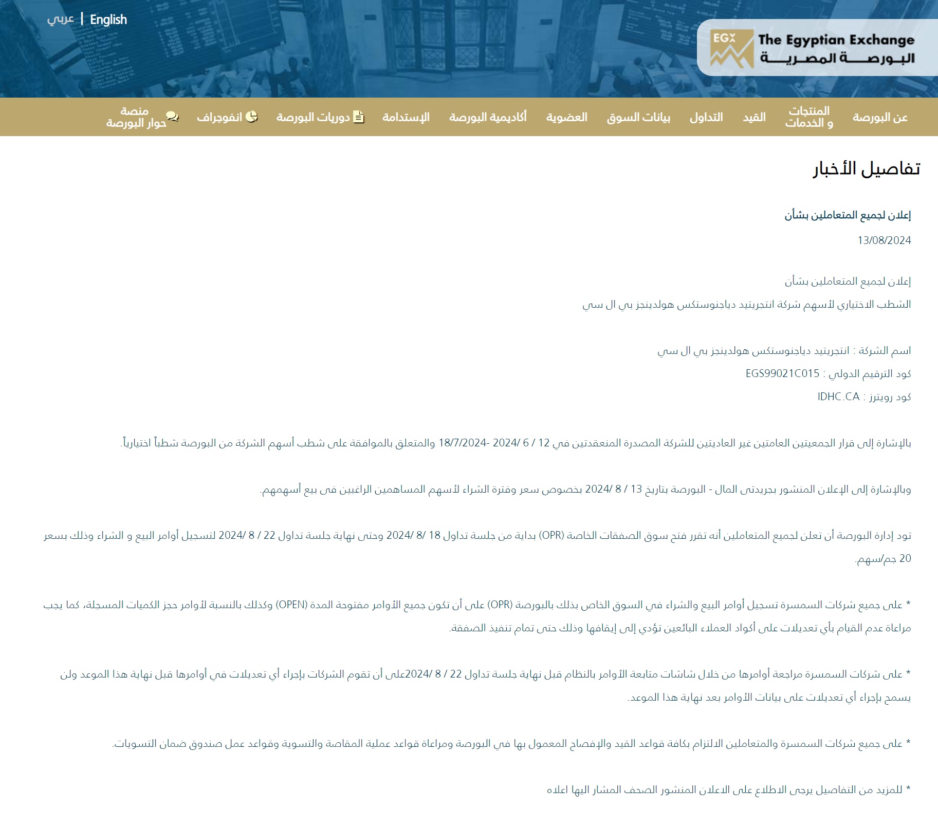 بدء إجراءات شطب أسهم التشخيص المتكاملة القابضة من البورصة الأحد المقبل: أمهلت البورصة المصرية مساهمي شركة التشخيص المتكاملة القابضة الراغبين في بيع أسهمهم ضمن إجراءات الشطب الاختياري من البورصة خمس جلسات في الفترة من 18-22 أغسطس لبيع الأسهم عبر سوق الصفقات الخاصة، بحسب بيان للبورصة المصرية. ستدفع الشركة 20 جنيها للسهم الواحد بعد أن اعتبرت البورصة المصرية أن السعر الأولي البالغ 18.62 جنيه منخفضا للغاية.