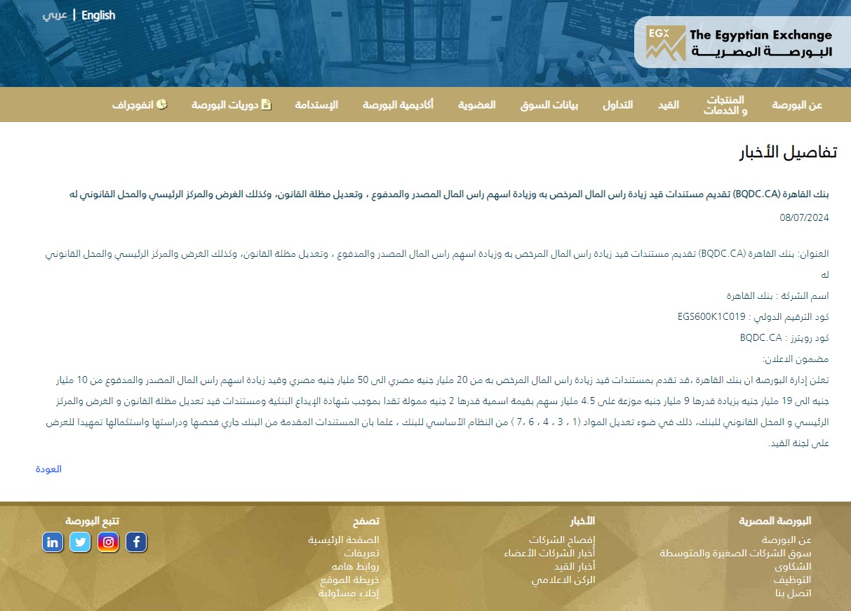 المستثمرون الأفراد والمؤسسات يبدأون الاكتتاب في أسهم شركة أكت فايننشال اليوم: تطرح شركة أكت فايننشال اليوم الثلاثاء نحو 32% من أسهمها - تمثل 360 مليون سهم - فيما سيكون أول طرح عام أولي تشهده البورصة المصرية منذ عام. ومن المقرر أن يكون الطرح العام خلال الفترة من 9-23 يوليو، والطرح الخاص خلال الفترة 9-18 يوليو. حددت الشركة سعر الطرح العام الأولي عند 2.90 جنيه للسهم، وتستهدف جمع نحو 1.04 مليار جنيه من خلال العملية.