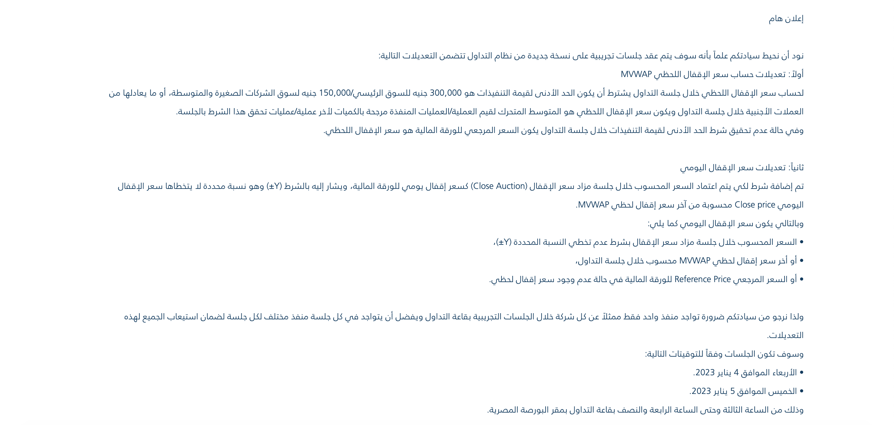 The EGX will be trialing an update (pdf) to its trading platform on Wednesday, 4 January and Thursday, 5 January from 3pm to 4:30pm. The update includes changes to the way stocks’ daily closing price is calculated and approved.