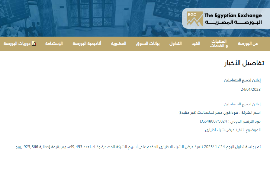 CLARIFICATION- Vodacom paid around EUR 18.71 per share to secure an additional 0.02% (49.5k shares) of Vodafone Egypt, according to figures in a bourse statement disclosing that the transaction has been executed. We previously reported that Vodacom paid a lower price of EUR 17.92 a piece, as per itsoriginal offer. It’s not clear when the price was upped. The South African subsidiary of Vodafone Group had initially sought to purchase as much as 0.05% of the company (124.6k shares) from minority shareholders in tandem with acquiring the parent company’s 55% stake in December.
