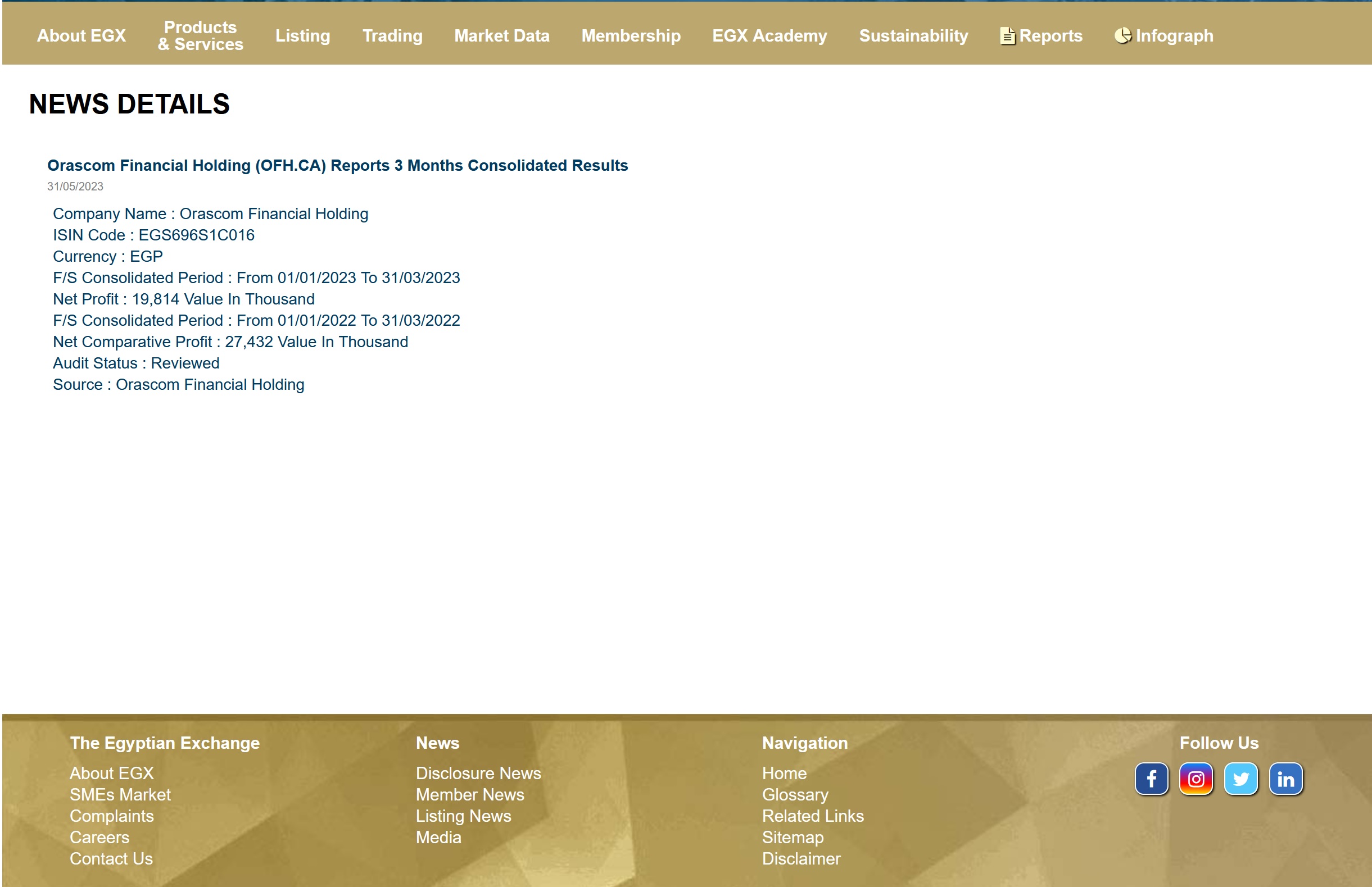 OFH by the numbers: The company’s net income declined 28% y-o-y to EGP 19.8 mn in 1Q 2023, down from EGP 27.4 mn, according to a disclosure to the EGX.