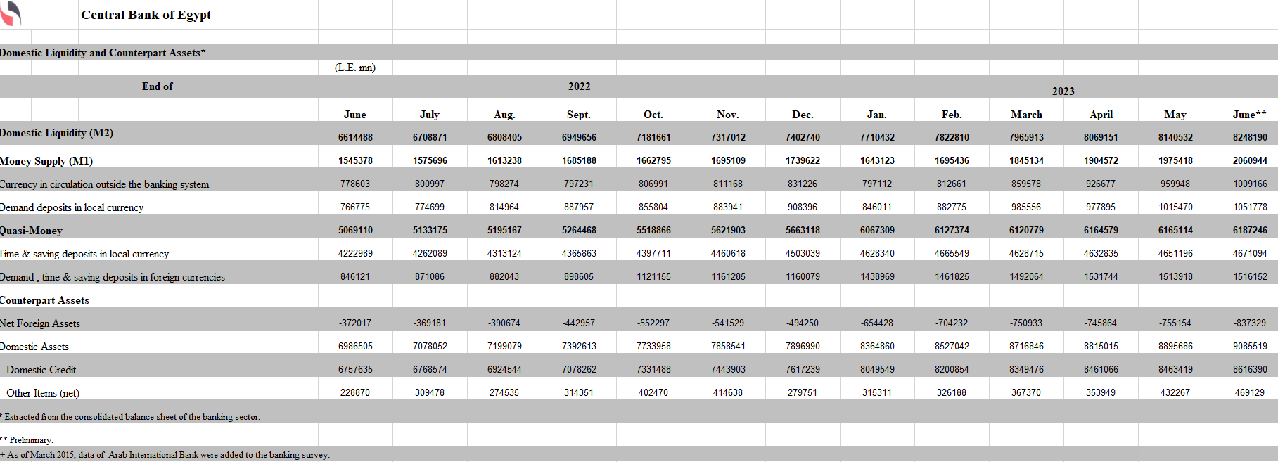Egypt’s money supply increased 24.6% y-o-y to EGP 8.2 trn in June 2023, according to central bank figures. The Central Bank of Egypt (CBE) has been heavily contributing to increasing the level of money supply in the economy mainly by purchasing government bonds, Reuters reports. This money has been used to finance government expenses, including “infrastructure projects including new cities and a vast expansion of roads while seeking to sustain some subsidies in order to prop up sliding living standards,” according to the newswire.
