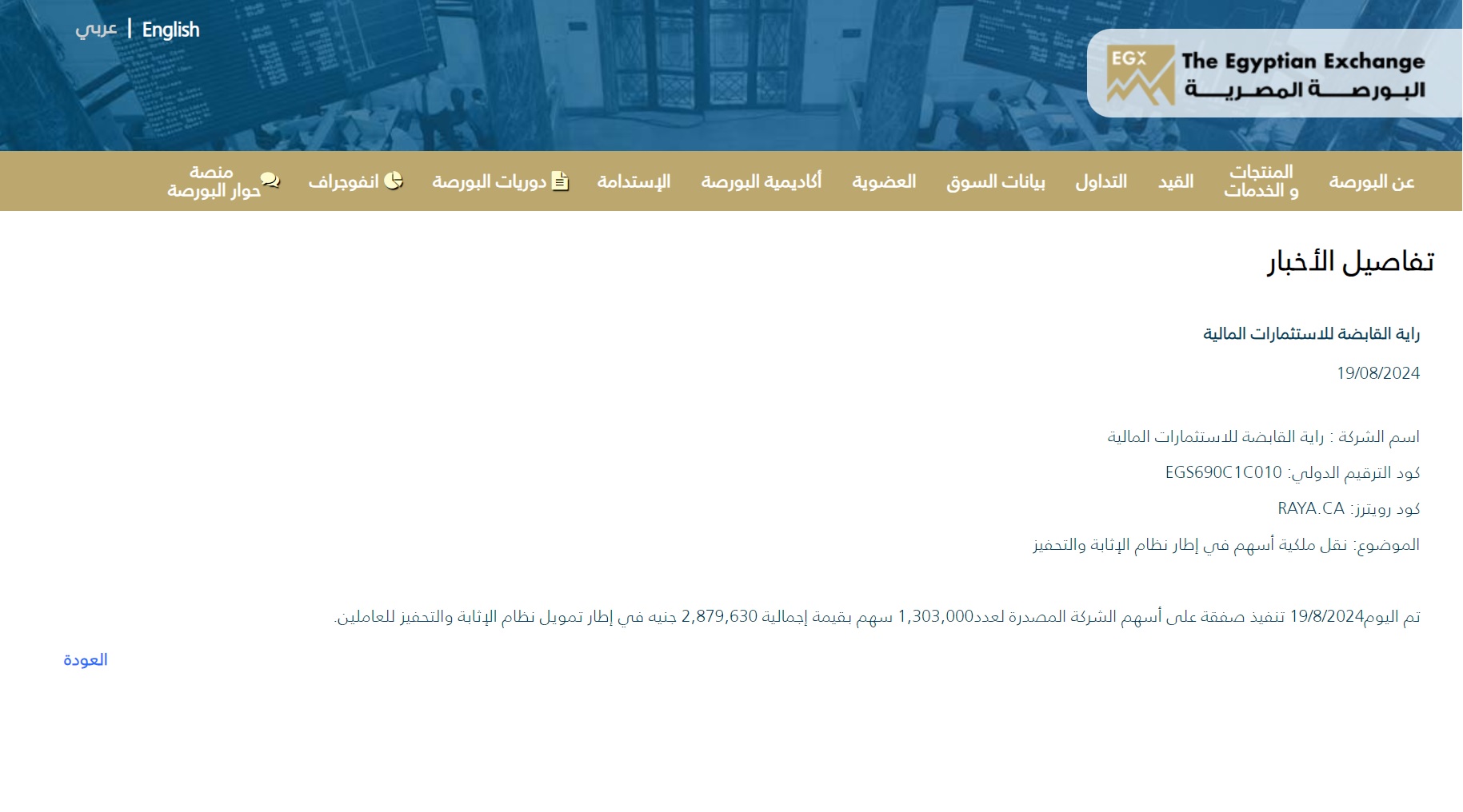 #1- Raya Holding transferred some 1.3 mn shares — worth some EGP 2.9 mn — to its employee stock ownership plan share program, according to an EGX bulletin.