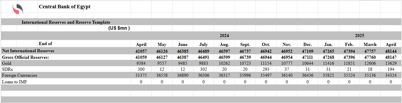 Net foreign reserves rose to USD 48.1 bn at the end of April 2025, marking a USD 387 mn increase from March, according to data from the Central Bank of Egypt. Net foreign reserves continued to increase m-o-m for the 32th consecutive month.