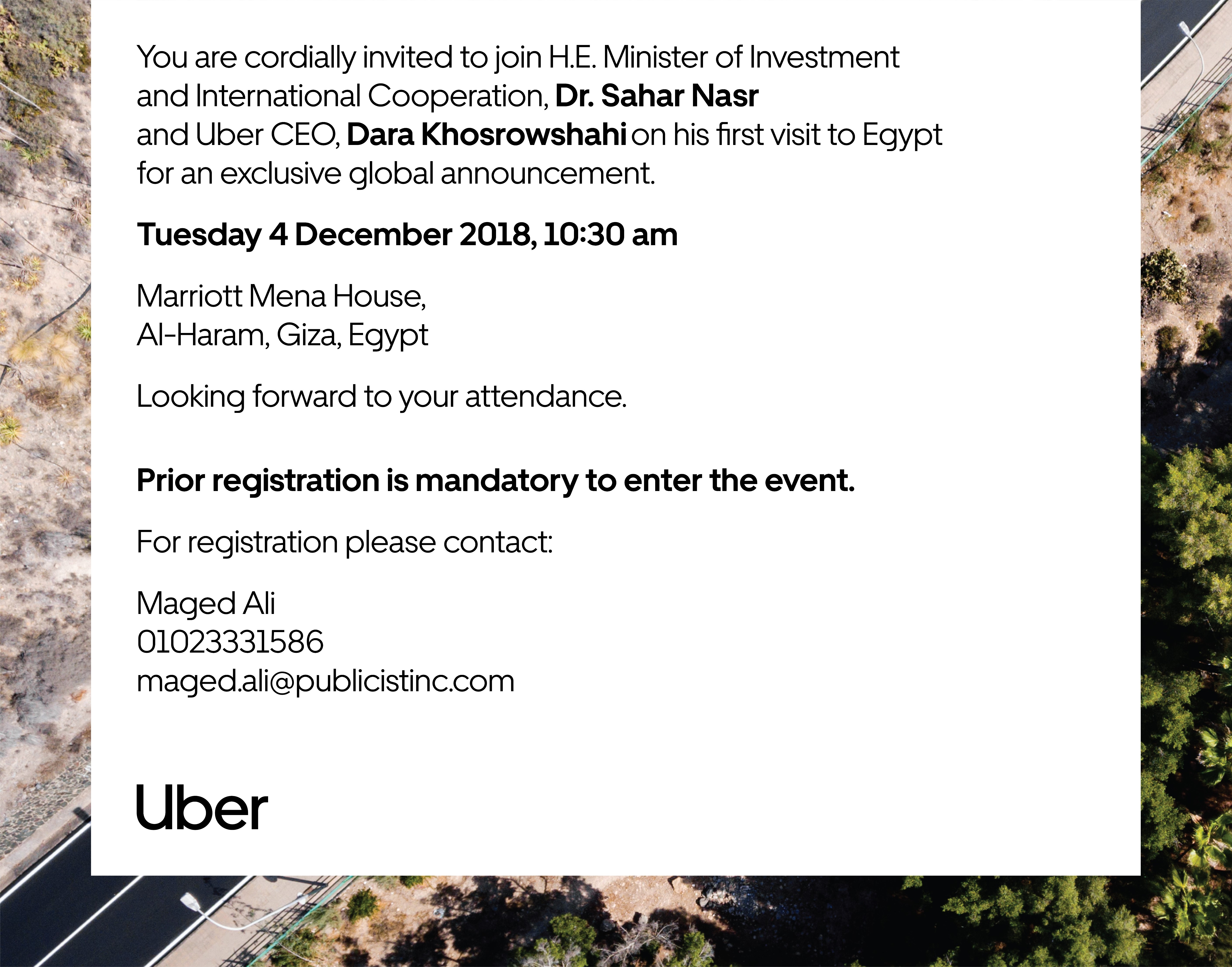Uber CEO Dara Khosrowshahi is due in Cairo on Tuesday for “an important announcement” with Investment Minister Sahar Nasr;
