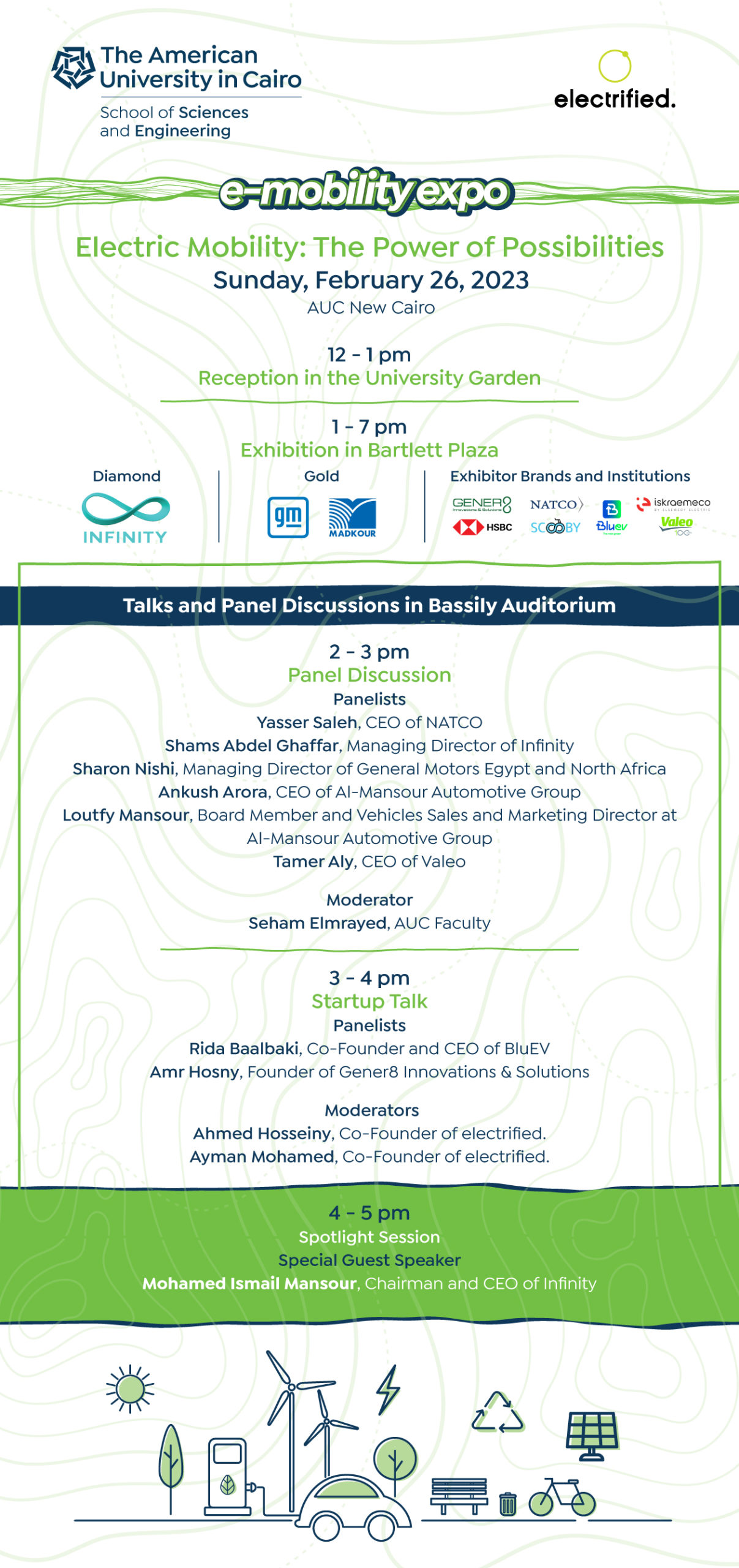 AUC + Electrified Egypt are organizing a one-day e-mobility expo today at the AUC New Cairo campus from 12pm to 5pm. Electric Mobility: The Power ofPossibilitiesExpo will bring together researchers, students, industry professionals, startups, environmentalists, developers, investors, and government officials. Industry leaders speaking at the event include our friend Mohamed Ismail Mansour, chairman and CEO of Infinity; Sharon Nishi, managing director of General Motors Egypt and North Africa; and Ankush Arora, CEO of Al Mansour Automotive.
