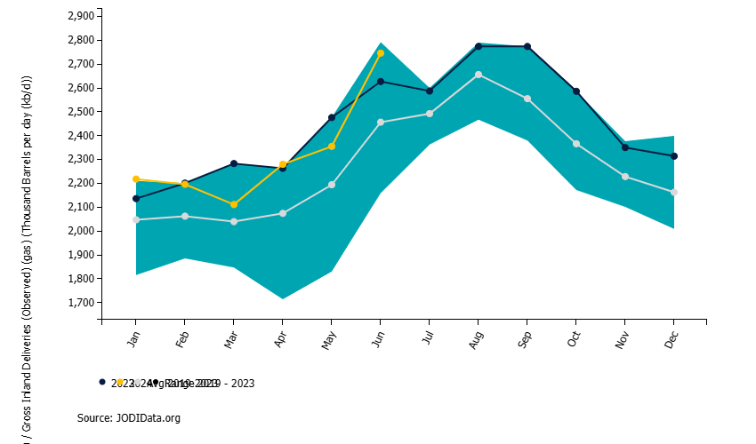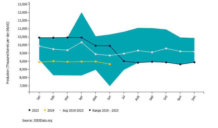 #1- Saudi crude production fell 12.9% y-o-y to 61.7 mn barrels per day (bbl / d) in 1H 2024, according to the latest data from the Joint Organizations Data Initiative. Demand for Saudi oil products inched down 0.6% over the same period to 13.9 mn bbl /d of observed gross inland deliveries.