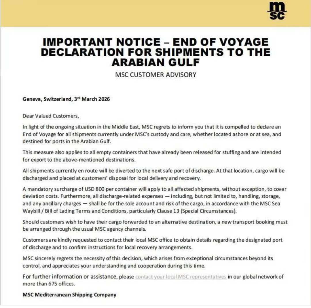 Good morning, friends. We’re entering day six of the war that is spilling beyond the battlefield — with trade and supply chains under heightened risk. Some carriers are already moving beyond surcharges: MSC has issued an ‘End of Voyage’ for Gulf-bound cargo, while Cosco has suspended Middle East bookings as the conflict escalates.